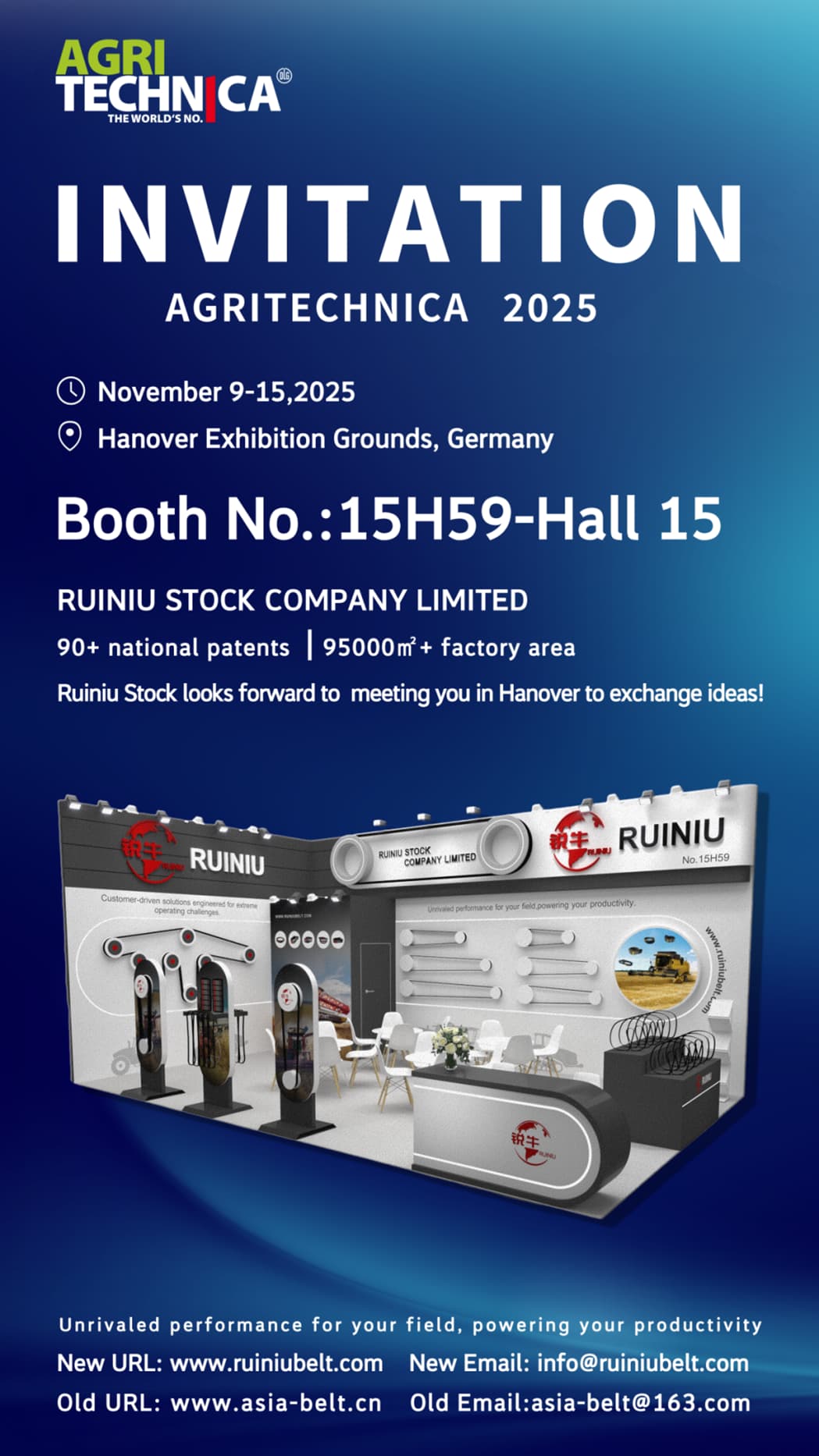 AGRITECHNICA คืองานแสดงสินค้าเครื่องจักรกลและเทคโนโลยีทางการเกษตรชั้นนำของโลก เป็นศูนย์กลางเชื่อมโยงผู้นำอุตสาหกรรม นวัตกรรม และผู้เชี่ยวชาญระดับโลก Ruiniu ภูมิใจที่ได้มีส่วนร่วมในงานนิทรรศการนี้ และเราจะนำเทคโนโลยีขั้นสูงและผลิตภัณฑ์นวัตกรรมของเรามาจัดแสดงในงาน
